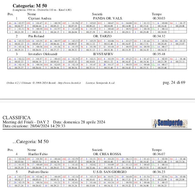 Non perfetto, non fulmineo, mai meglio del 4° tempo di tratta, non geniale nella sceltona per la 13, ma un solo errore serio (1' alla 12 dove mi faccio tentare dal crinale sbagliato) e tantissimo ori-piacere, che mi fanno chiudere al 6° posto, dietro a gente proprio forte, che però non è poi così lontana (ok, tranne Choban, che però è quasi nazionale Ukraino e ha 15 anni meno di me). Il Perfido chiude di nuovo terzo, e bravo lui di nuovo.